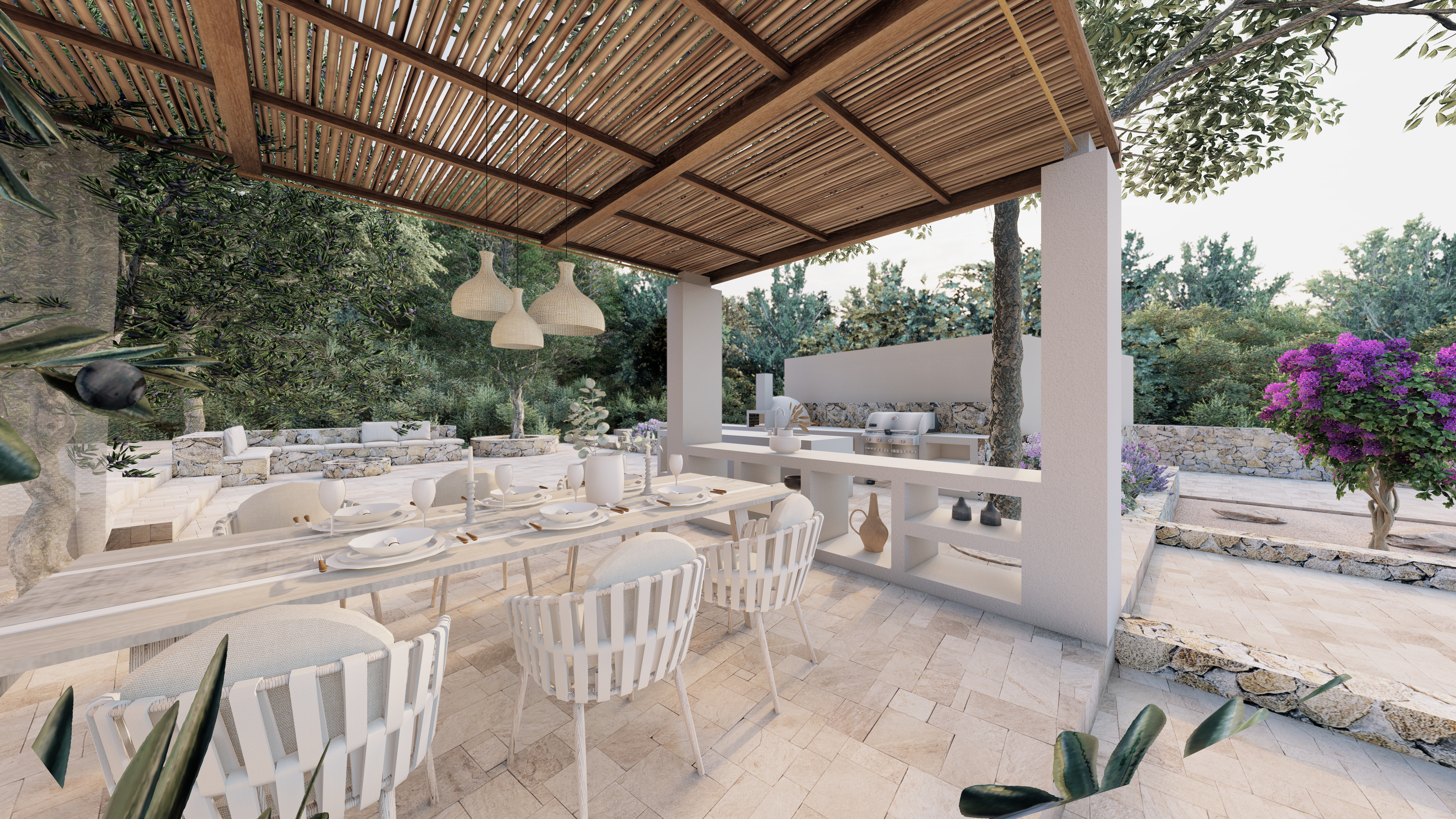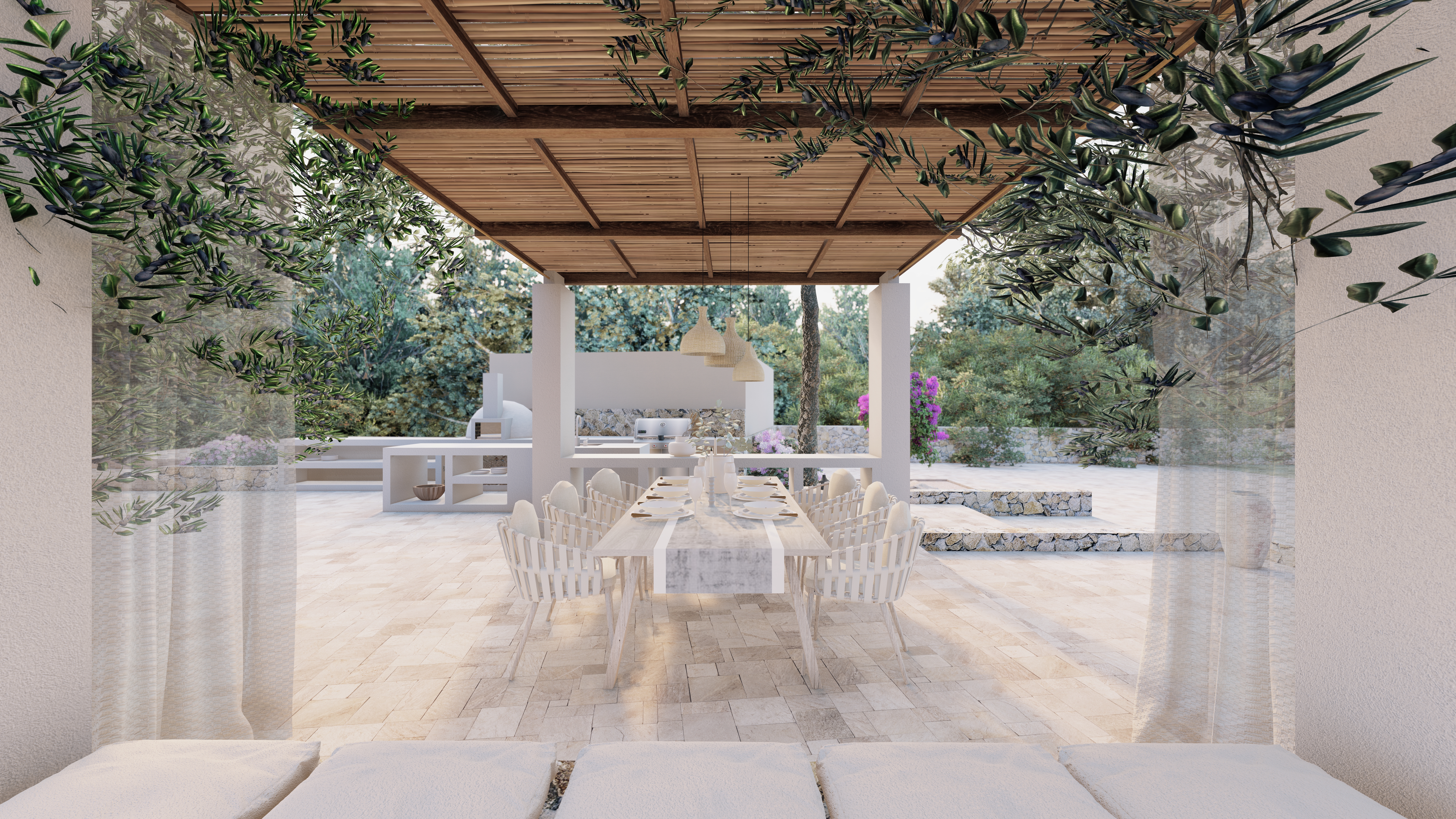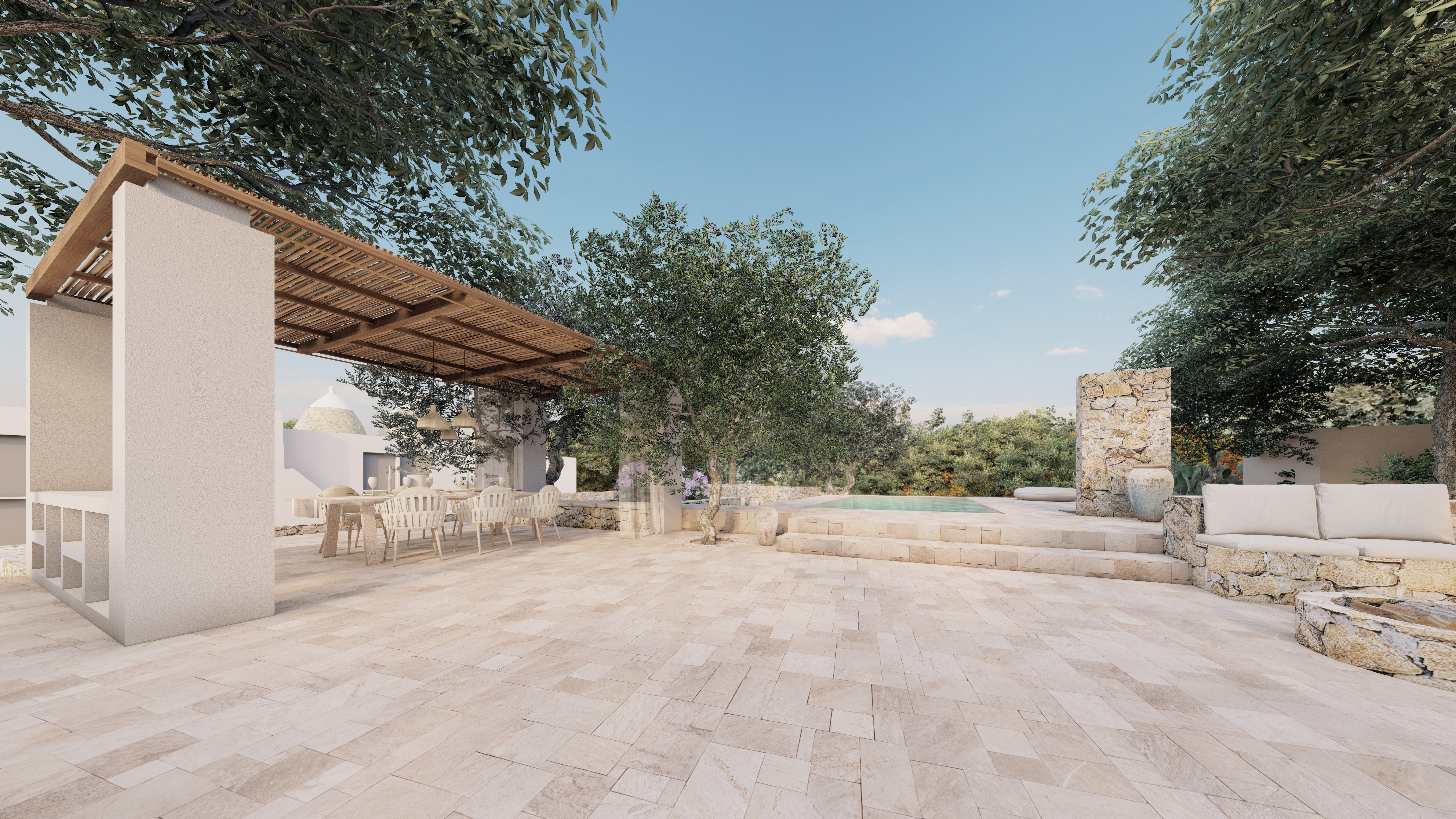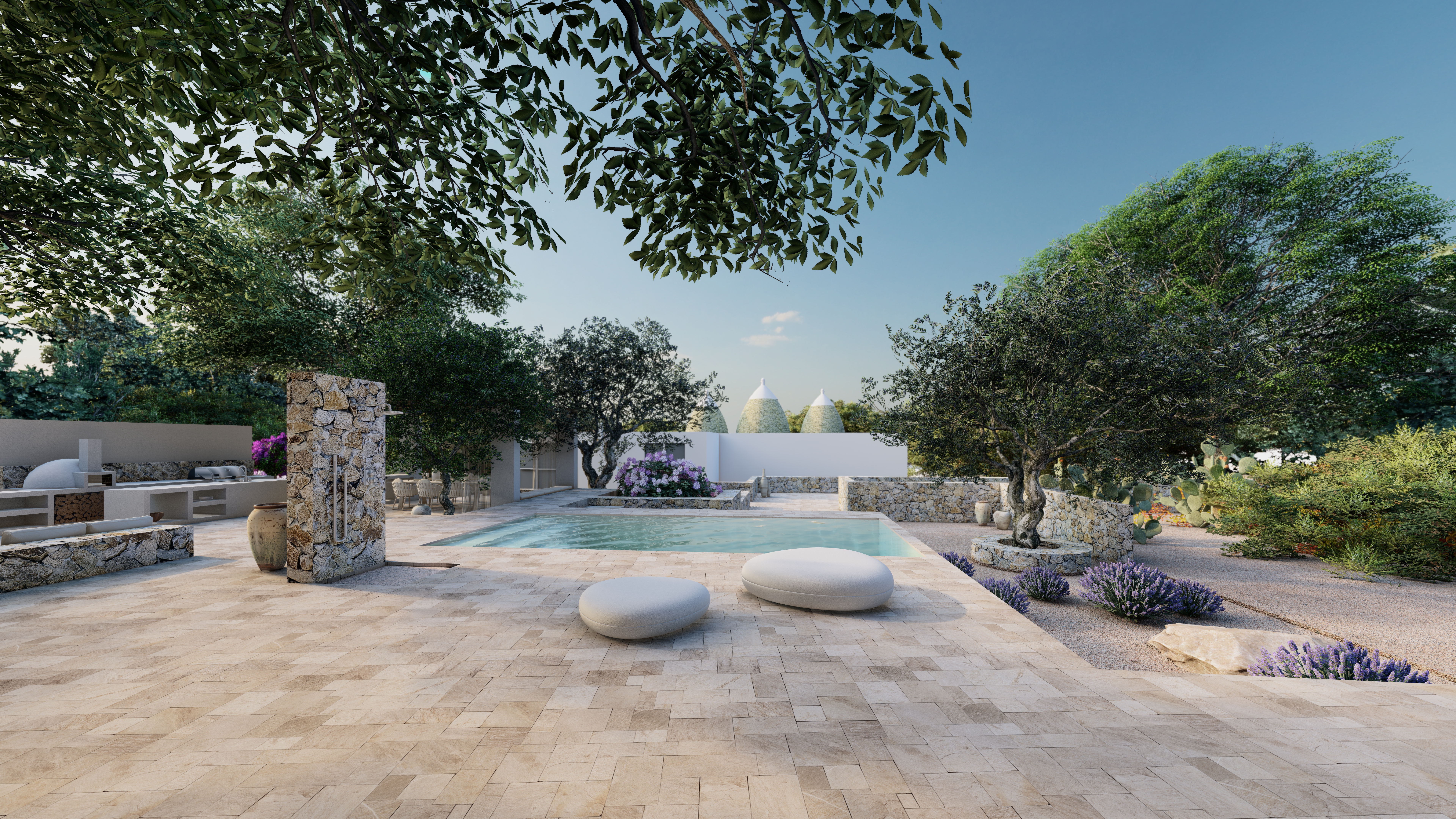 This outdoor retreat in Puglia seamlessly blends natural beauty with refined design, featuring an elegant stone-clad infinity pool, a stylish outdoor kitchen, and a pergola-shaded dining area. Locally sourced stone walls, warm travertine flooring, and lush Mediterranean greenery create a sophisticated yet organic aesthetic. Native olive trees, lavender, and vibrant bougainvillea enhance the tranquil atmosphere, while carefully selected furnishings and ambient lighting add to the inviting ambiance. The space is thoughtfully designed to embrace the essence of Southern Italian outdoor living, balancing luxury with authenticity for a timeless and harmonious experience.