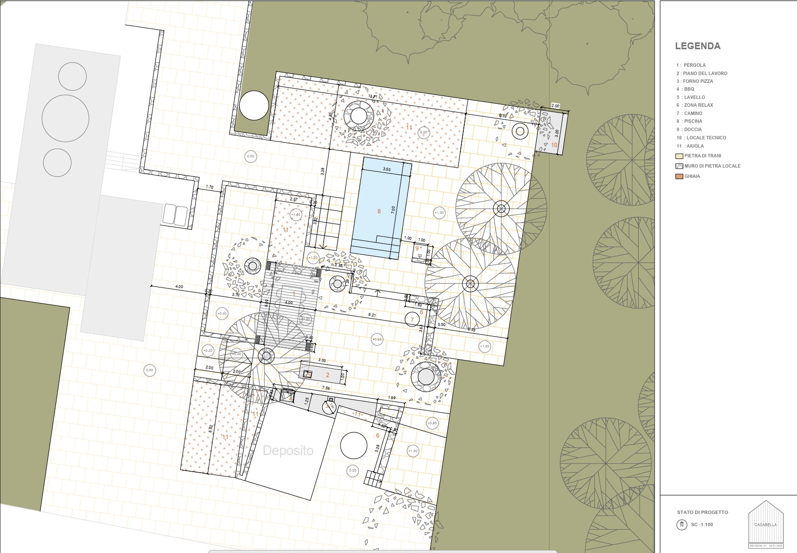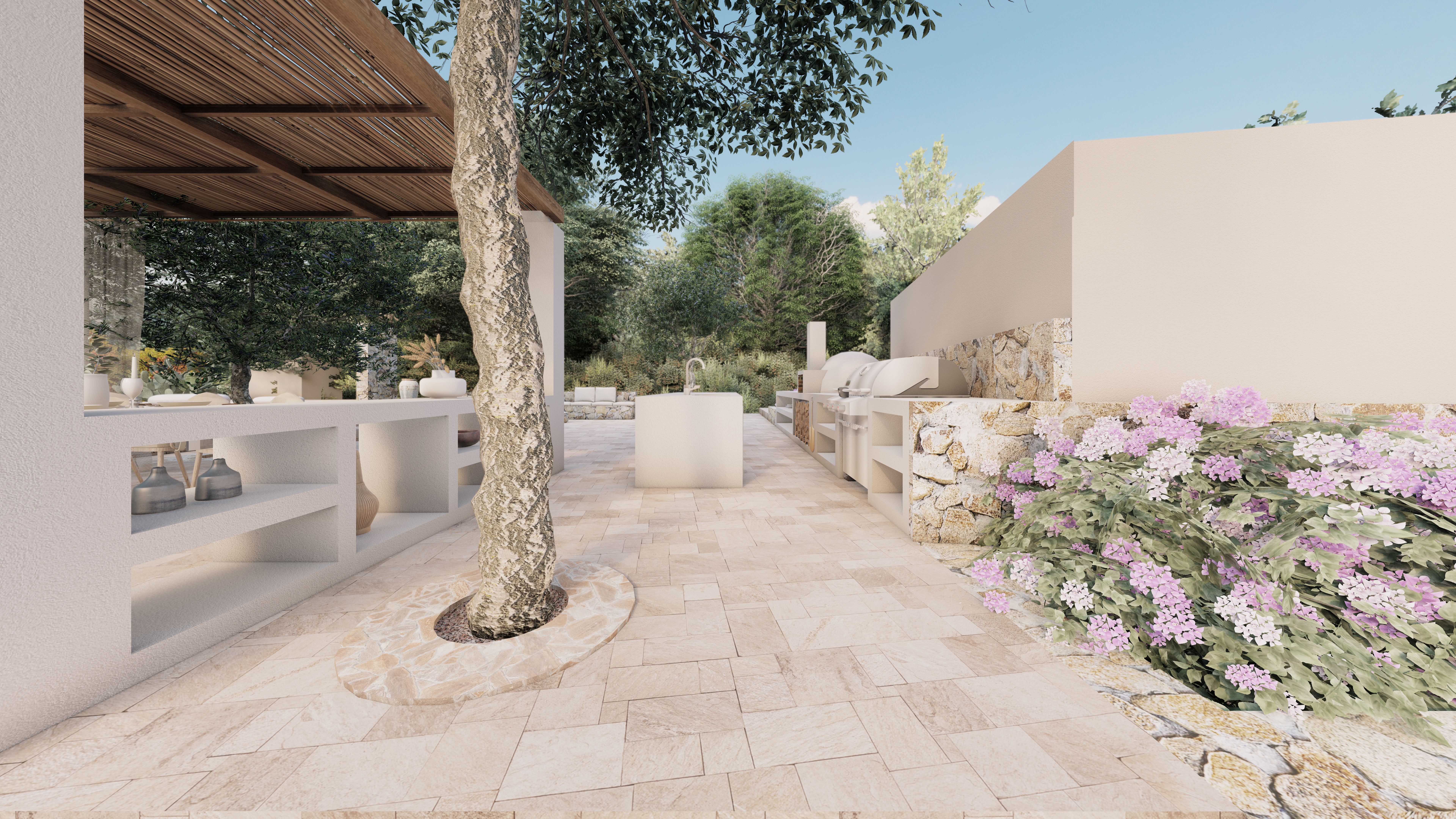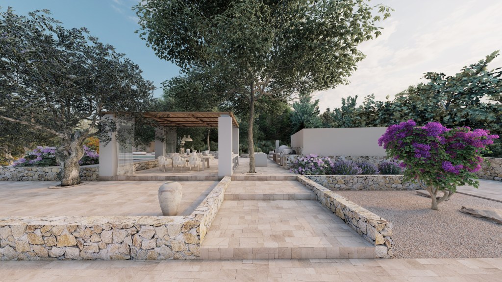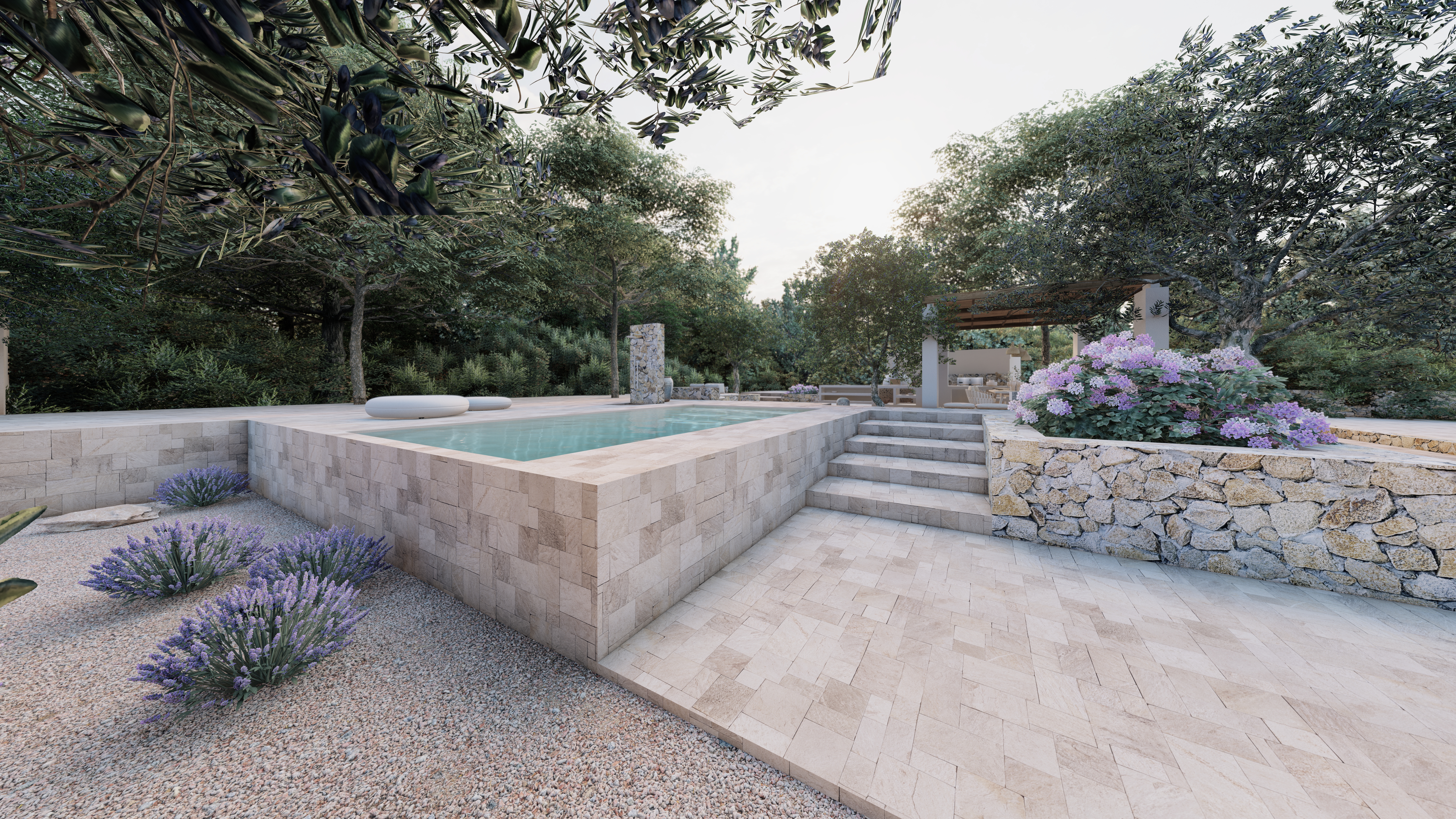 This outdoor retreat in Puglia seamlessly blends natural beauty with refined design, featuring an elegant stone-clad infinity pool, a stylish outdoor kitchen, and a pergola-shaded dining area. Locally sourced stone walls, warm travertine flooring, and lush Mediterranean greenery create a sophisticated yet organic aesthetic. Native olive trees, lavender, and vibrant bougainvillea enhance the tranquil atmosphere, while carefully selected furnishings and ambient lighting add to the inviting ambiance. The space is thoughtfully designed to embrace the essence of Southern Italian outdoor living, balancing luxury with authenticity for a timeless and harmonious experience.